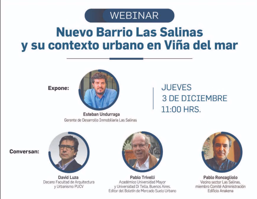 En esta ocasión, los panelistas serán el Decano de la Facultad de Arquitectura y Urbanismo de PUCV, David Luza; el Académico de la Universidad Mayor y experto en Urbanismo, Pablo Trivelli; y el miembro del Comité de Administración del Edificio Anakena y representante de vecinos del sector Las Salinas, Pablo Rocagliolo.