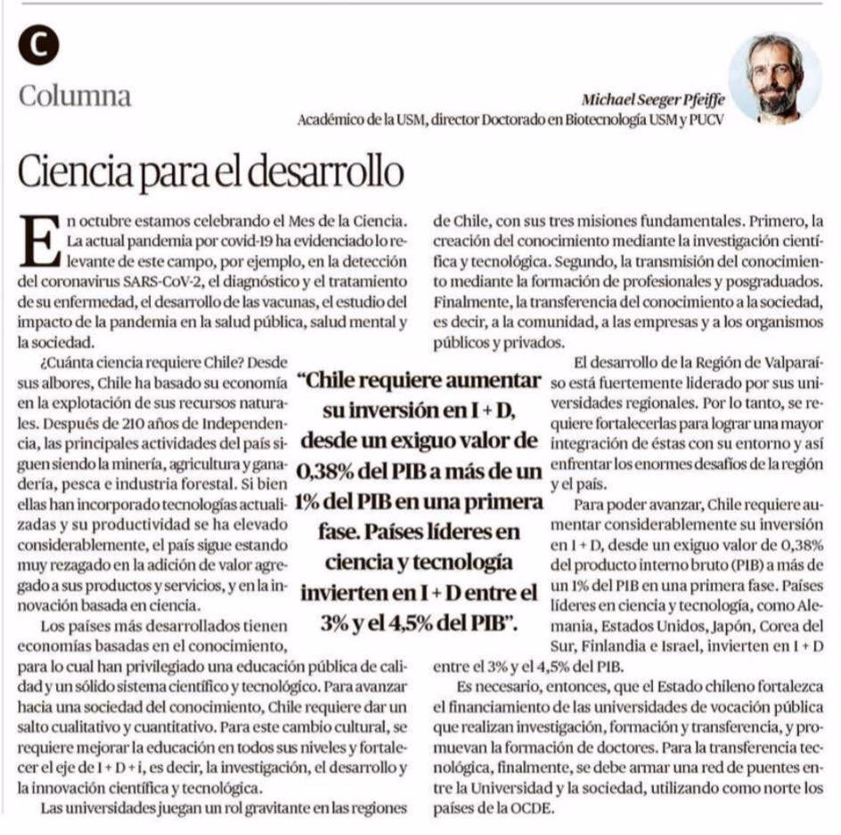 El profesor Michael Seeger, Académico de la Universidad Técnica Federico Santa María y director del Doctorado en Biotecnología de la USM y PUCV, publica en El Mercurio de Valparaíso la columna Ciencia para el desarrollo.