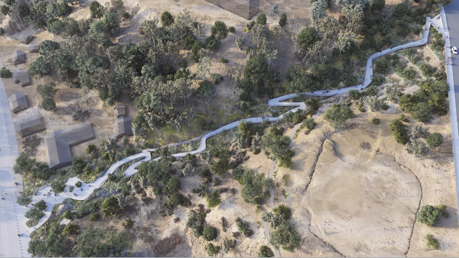 Se plantea un paseo peatonal enfocado en la accesibilidad universal e inserto en un proyecto de restauración biológica de la ladera del sector.