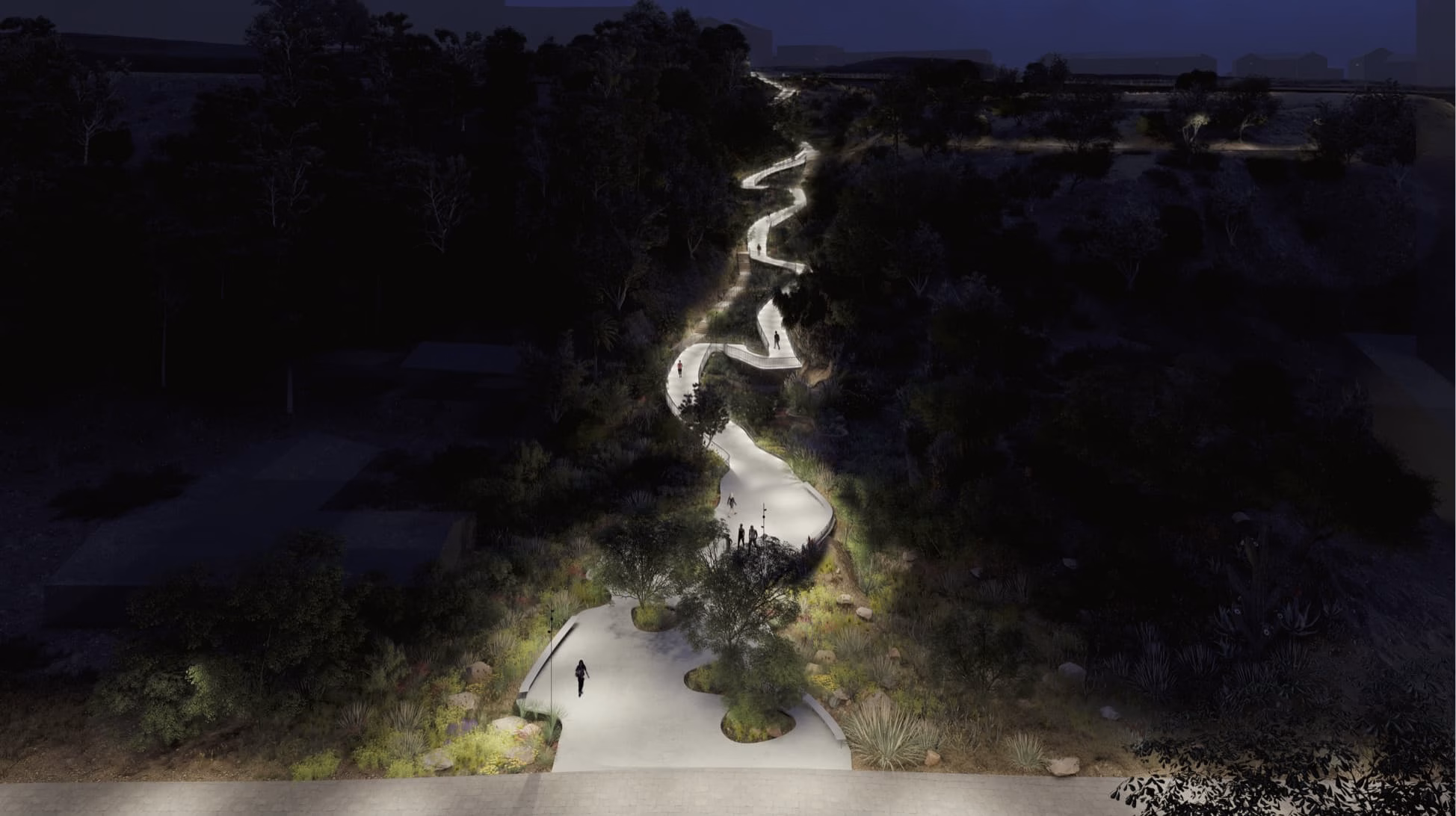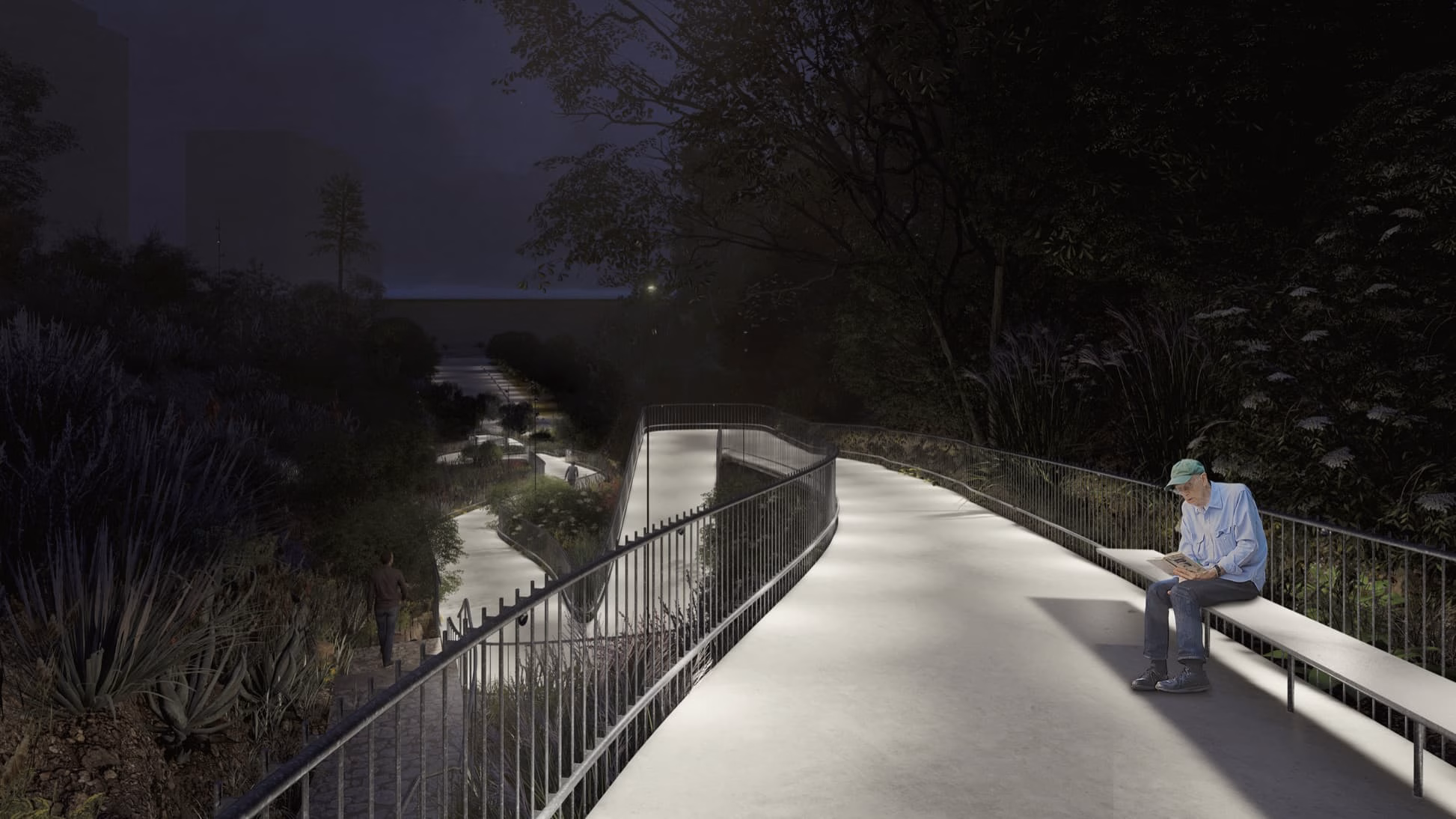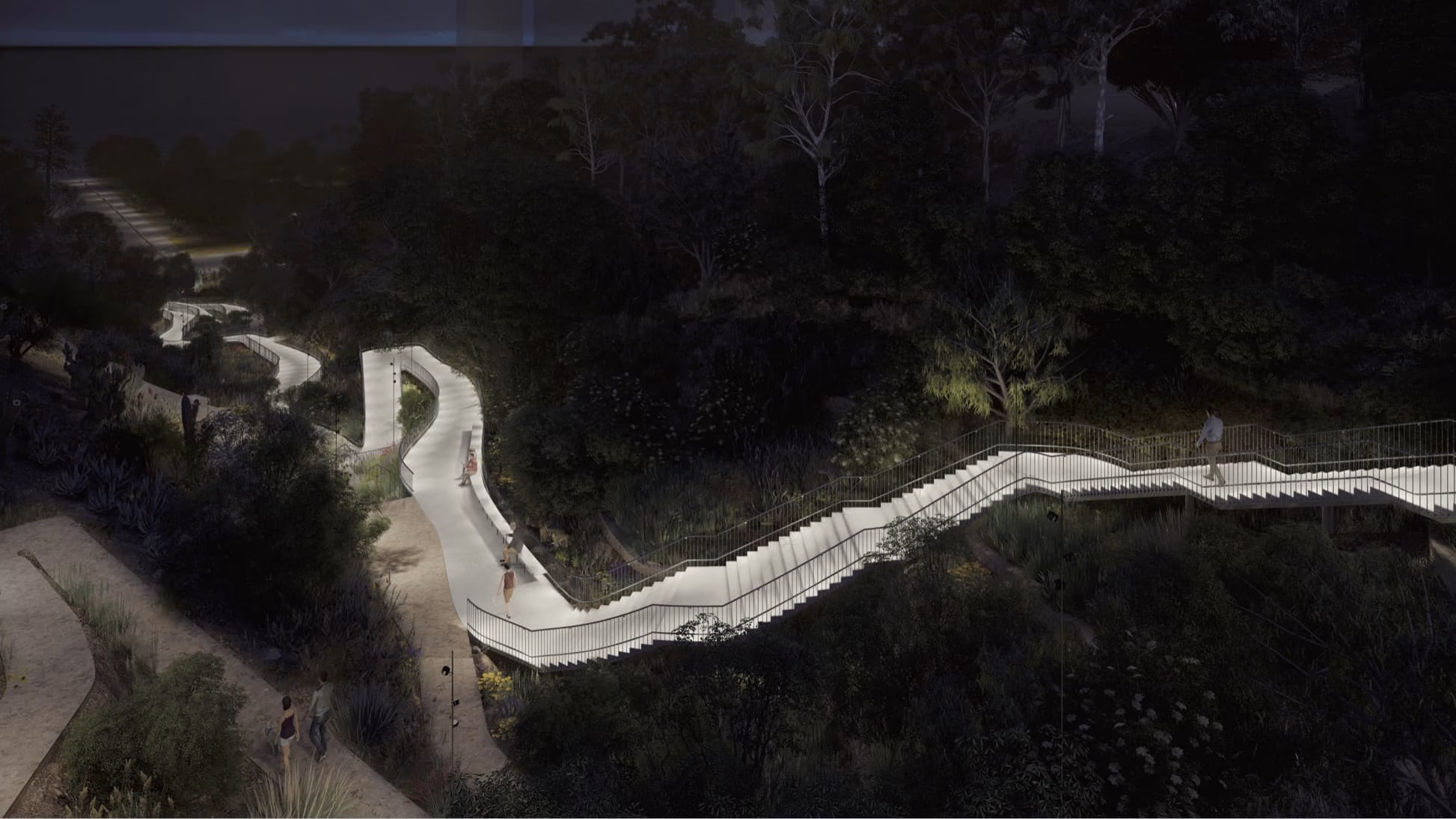 El sistema de rampas se combina con escaleras, generando dos sistemas de circulación en paralelo. Esta modalidad combinada permite crear espacios de circulación para dos tipos de peatones; quienes van más apurados o deben usar continuamente el acceso pueden usar el sistema de escalera, mientras que quienes quieran realizar un recorrido pausado, para apreciar la naturaleza o usar el espacio como un lugar de encuentro, pueden utilizar las rampas. La iluminación nace de la baranda para no generar contaminación lumínica en el lugar; las detenciones cuentan con focos para hacerlo más seguro.