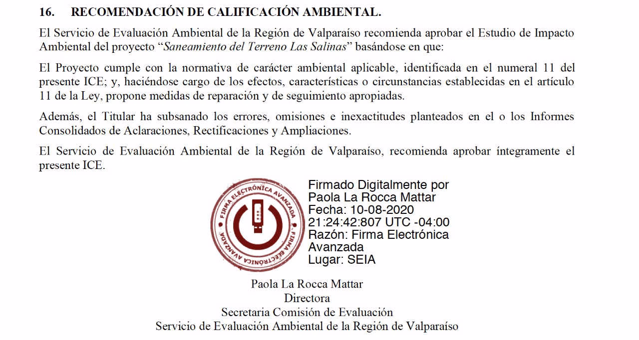 On August 10, the SEIA was submitted to Las Salinas, with a recommendation for approval by the environmental authority. The EIA was submitted to the Environmental Evaluation System in December 2018, with a proposal for the remediation of the land through an on-site bioremediation process (on the same site) in order to not generate environmental externalities during its treatment and to safeguard the health of people. This indication from the SEA, after a year and a half of processing, implies that the project complies with environmental regulations, takes responsibility for the effects and proposes appropriate remediation and follow-up measures. The document states that “the project owner corrected the errors, omissions and inaccuracies raised in the Consolidated Reports of Clarifications, Rectifications and Amplifications (ICSARA)”. Therefore, “the Environmental Assessment Service of the Valparaíso Region recommends approval of the Environmental Impact Study for the Saneamiento del Terreno Las Salinas project,” the report explains. The complete document issued by the Environmental Impact Evaluation Service can be downloaded at .