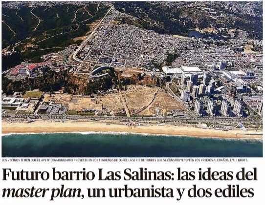 In an article published in El Mercurio Valparaíso on Sunday, September 6th, the urban possibilities for the Las Salinas site are discussed. The complete article can be found here: Whether it considers a park next to the hill, buildings or viewpoints, all agree that the development of a new sector in the city requires broad participation and monitoring. Beyond the controversy and the appeals announced against the environmental cleanup of the 16 hectares of land owned by Copec in the Las Salinas sector of Viña del Mar, the question arises as to the urban destination of the property. Capable like few others of arousing heated discussions, the site is totally unused and its location right in front of the sea, very close to the commercial pole of 15 Norte and with immediate access to Jorge Montt Avenue, arouses the real estate appetite of large firms, both in Santiago and in the Region. An example of this is the purchase offer made by the businessman Abraham Senerman in 2008, which reached 70 million dollars for the 16 hectares. The land in Viña del Mar also attracted the interest of the Solari family, owner of the Falabella holding company, through the Bethia group. However, these options were discarded by Copec, which decided to create its own real estate company – Las Salinas – to carry out an idea of new urbanization that they consider to be different.