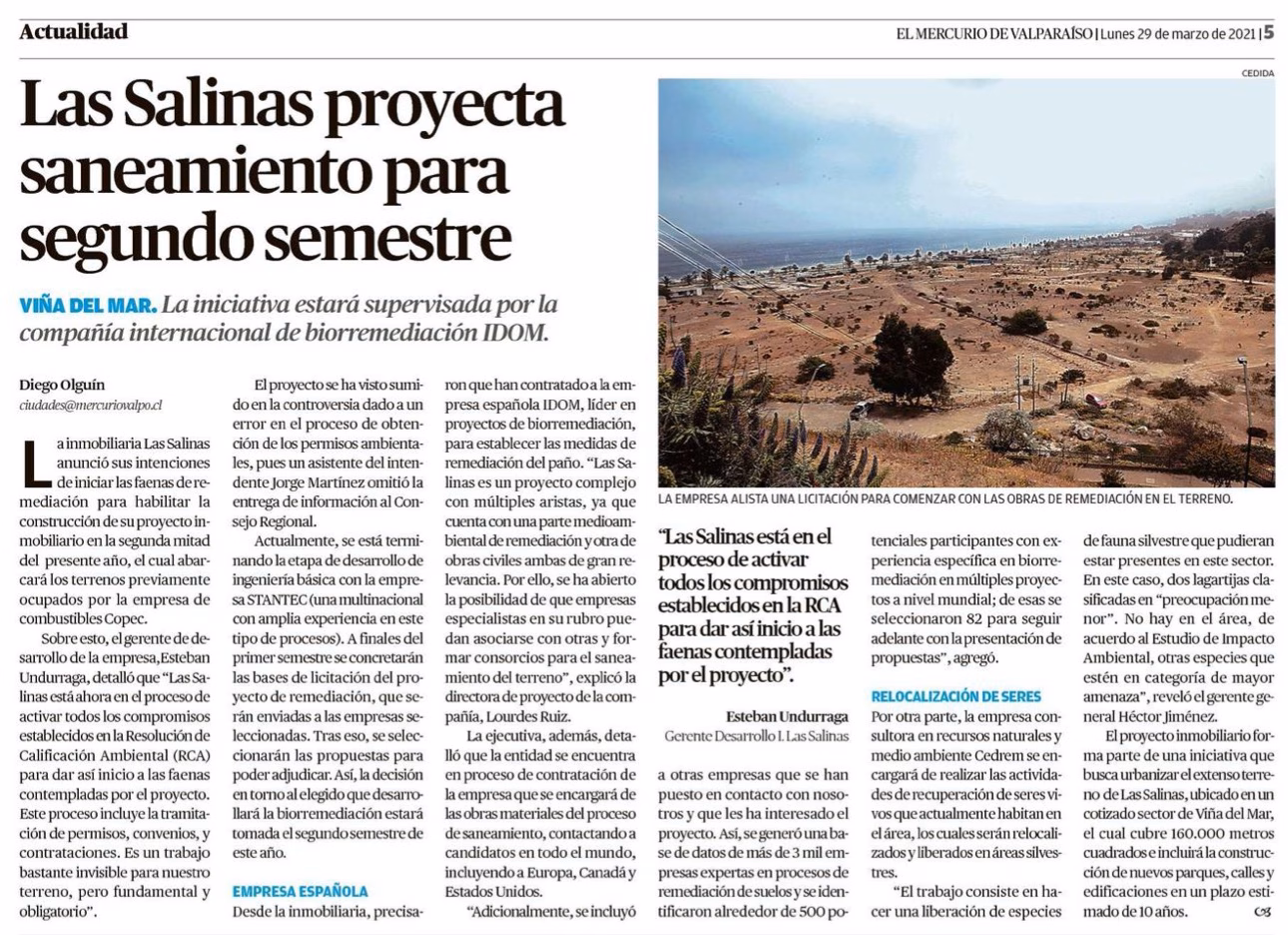Las Salinas hace ya unos meses contrató a IDOM, firma española, líder a nivel mundial en proyectos de biorremediación, para dirigir técnicamente el proceso de saneamiento de Las Salinas. Esta empresa, es experta a nivel internacional en el gerenciamiento de proyectos ambientales para el rescate de pasivos ambientales. IDOM trabaja en consultorías, proyectos de ingeniería y arquitectura en todo el mundo. Entre sus trabajos destaca, por ejemplo, la conocida regeneración urbana de los terrenos industriales del centro de Bilbao, en España.