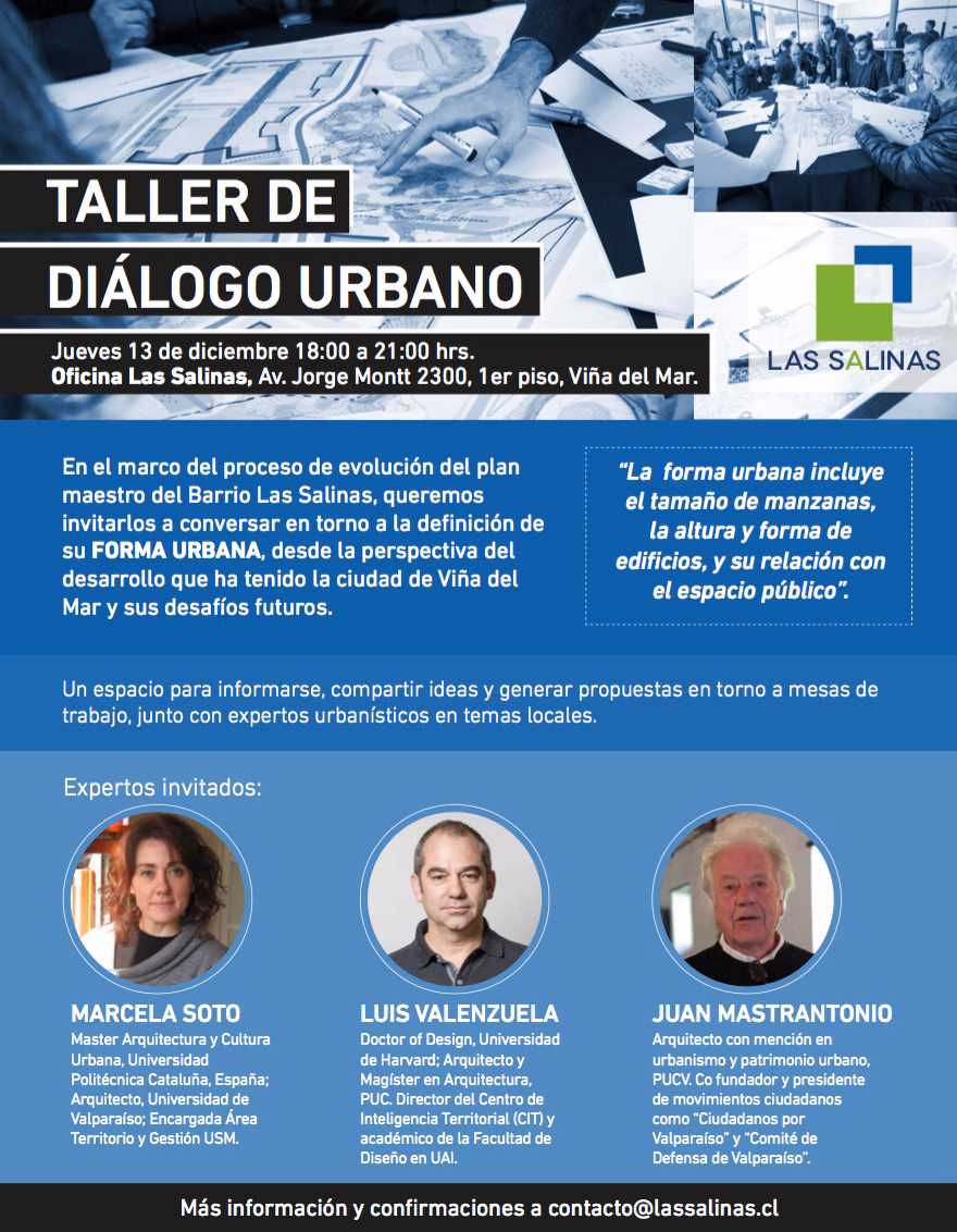 Siguiendo con el proceso de optimización del Pan Maestro del Barrio Las Salinas que hemos llevado a cabo durante todo este año 2018, queremos invitarlos a un nuevo , en la oficina de Las Salinas, ubicada en Jorge Montt 2300, primer piso, Viña del Mar.